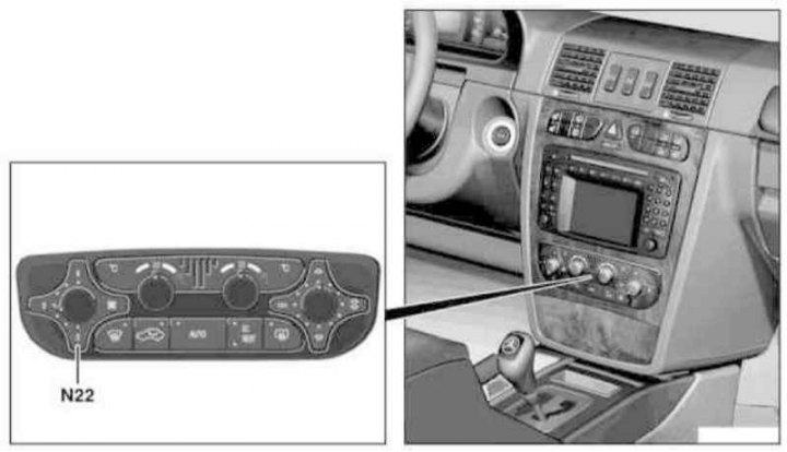 Примечание. После замены панели управления HVAC необходимо произвести процедуру синхронизации сервомоторов с помощью диагностического сканера STAR DIAGNOSIS, подключаемому к разъему DLC автомобиля (см. иллюстрацию Схема подключения считывателя STAR DIAGNOSIS (0100) к диагностическому разъему DLC (Х11/4)), - обратитесь на фирменную СТО Mercedes-Benz. Также произведите очистку памяти процессора системы бортовой самодиагностики.